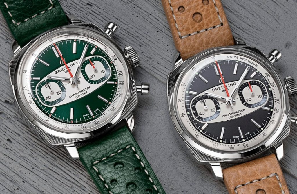 Cheap fake Breitling Top Time watches are available in either a striking black-and-white combination with a beige leather strap, or a vibrant green-and-white dial paired with a matching green perforated leather racing strap (reminiscent of vintage driving gloves).